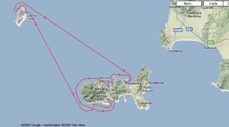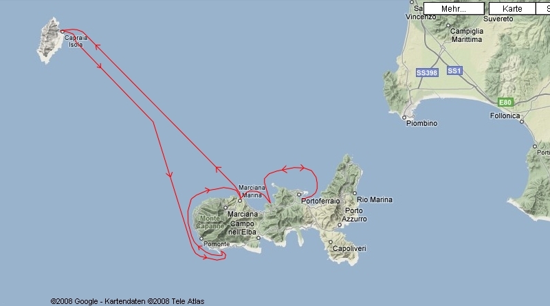 | Um 7:15 Uhr von Capraia Richtung Elba abgelegt. Ursprünglich wollten wir in der Bucht von Fetovaia ankern, der Ankerplatz war aber wegen dem starken SE-Wind zu unruhig. In der Hoffnung das es in Marina di Campo besser wird, segeln wir dorthin, aber auch dort war es nicht besser. Uns blieb nichts anderes übrig als weitere 17 sm nach Marciana Marina zu segeln. Unterwegs hatten wir bis 32 knoten Fallböen, dabei wurde unser Bimini aus den Gelenken rausgerissen, wir konnten ihn aber rechtzeitig vom überbord gehen retten. Um 17:20 in Westteil der Marciana Marina vor Buganker und Heckleinen angelegt. Zum Abendessen haben wir zehn verschiedene und sehr leckere Pizzen an Bord geholt. | ||||