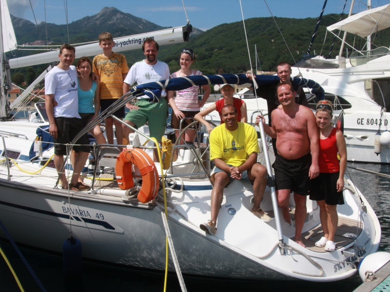 | Nach 14 Stunden Fahrt mit dem Auto - Distanz von Pforzheim bis Piombino 950 km - geht es mit der Fähre nach Portoferaio weiter. Hier übernehmen wir unsere Charteryacht "SKYWALKER" (Bavaria 49). Am nächsten Tag geht es gleich nach Capraia. In NW der Insel haben wir drei große Grotten mit Dinghy erkundet, ein wenig Sonne getankt und gegen Abend mit Mooringleine und zwei Heckleinen im Hafen angelegt. Ein Teil der Crew ging zu den alten Burgruinen, die Andere haben das Abendessen zubereitet. Die Insel ist auf jeden Fall einen Besuch Wert. | ||||
